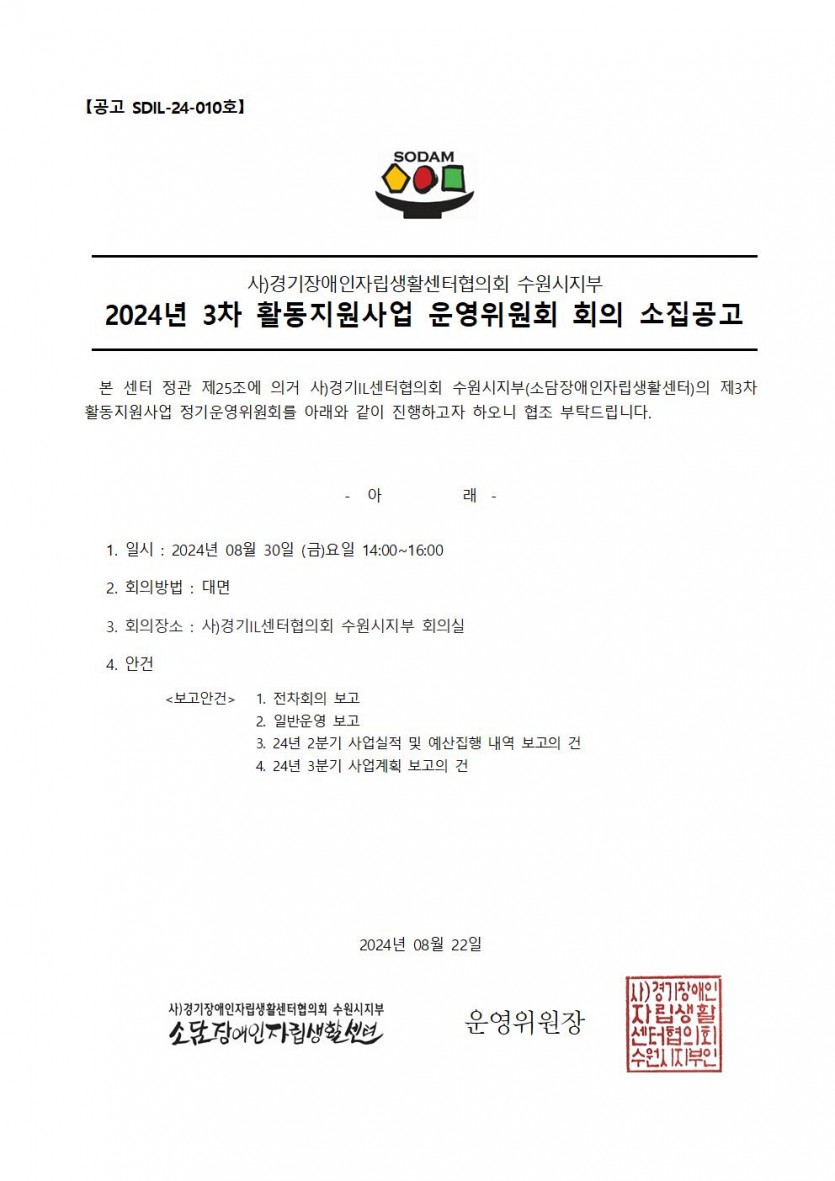 2024년 활동지원사업 3분기 정기운영위원회 회의 소집공고 페이지 정보 작성자 소담센터 댓글 0건 조회 943회 작성일 24-08-22 09:57 본문 2024년 활동지원사업 3분기 정기운영위원회 회의 소집공고 목록 이전글2024년 자립생활지원팀 신입 활동가 최종 합격자 공고 24.08.26 다음글2024 독서심리지원이 시작됩니다. 24.08.13 댓글목록 댓글목록 등록된 댓글이 없습니다.