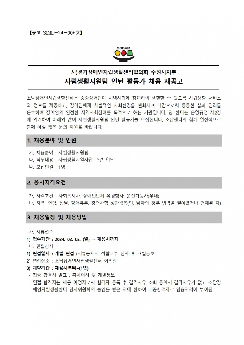 2024년 자립생활지원팀 인턴활동가 채용 재공고의 건
