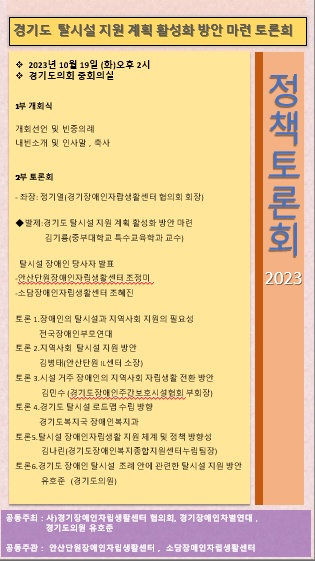 1019 경기도 탈시설 지원 계획 활성화 방안 마련 토론회 페이지 정보 작성자 소담센터 댓글 0건 조회 1,018회 작성일 23-10-15 22:59 본문 많은 관심과 의견 모아봅니다. 목록 이전글2023년 자립생활지원사업 4분기 정기운영위원회 개최의 건 23.10.24 다음글1013 소담소담한 장애 인권 북콘서트에 여러분들을 초대합니다. 23.09.22 댓글목록 댓글목록 등록된 댓글이 없습니다.