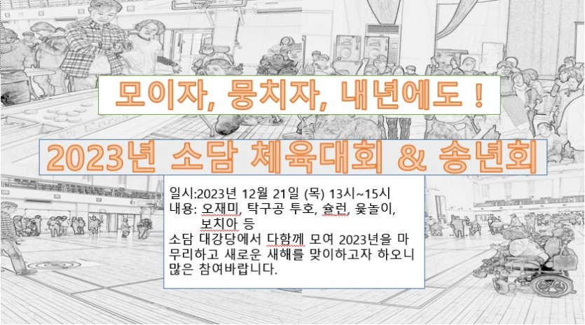 1210 소담체육대회 & 송년회 페이지 정보 작성자 소담센터 댓글 0건 조회 1,066회 작성일 23-12-18 10:41 본문 2023년을 보내며 함께 모여 마지막을 알차게 보낼시간을 마련했으니 소담 자조모임 서로도와 , 보치아 회원들의 많은 참여 바랍니다. 목록 이전글2024년 1차 활지 운영위원 회의 소집공고 24.01.11 다음글0131 자조모임 보치아 참가자를 모집합니다. 23.01.31 댓글목록 댓글목록 등록된 댓글이 없습니다.