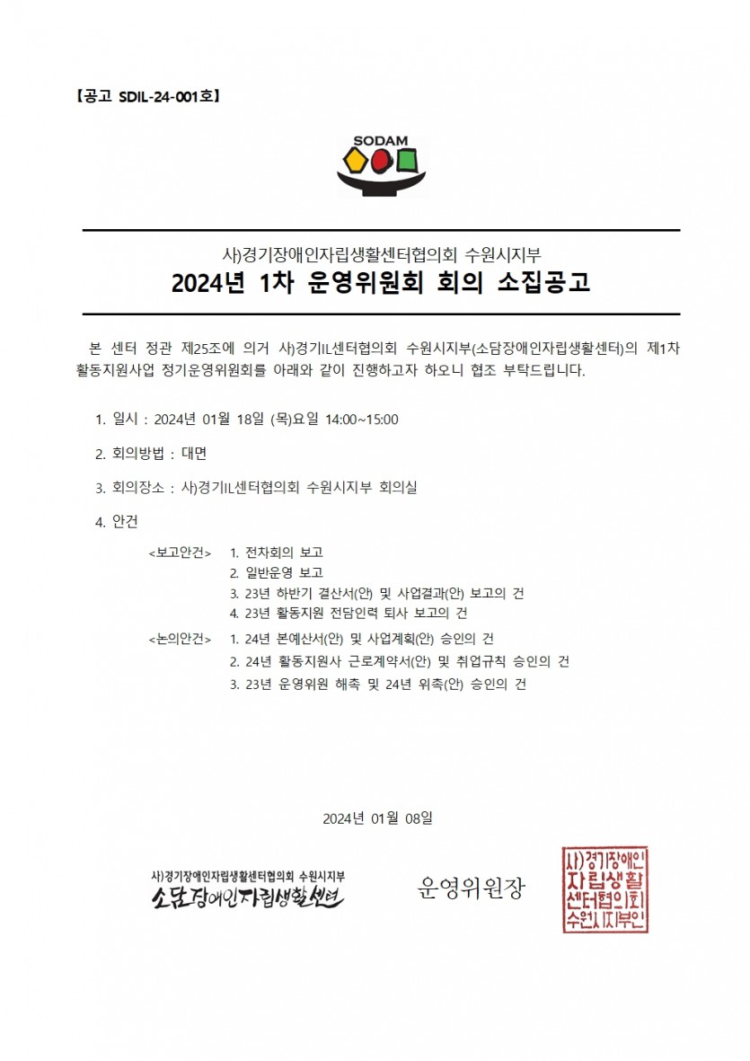 2024년 1차 활지 운영위원 회의 소집공고 페이지 정보 작성자 소담센터 댓글 0건 조회 1,058회 작성일 24-01-11 09:58 본문 . 목록 이전글수원 성모척관병원 MOU 업무협약 체결 23.08.09 다음글1210 소담체육대회 & 송년회 23.12.18 댓글목록 댓글목록 등록된 댓글이 없습니다.
