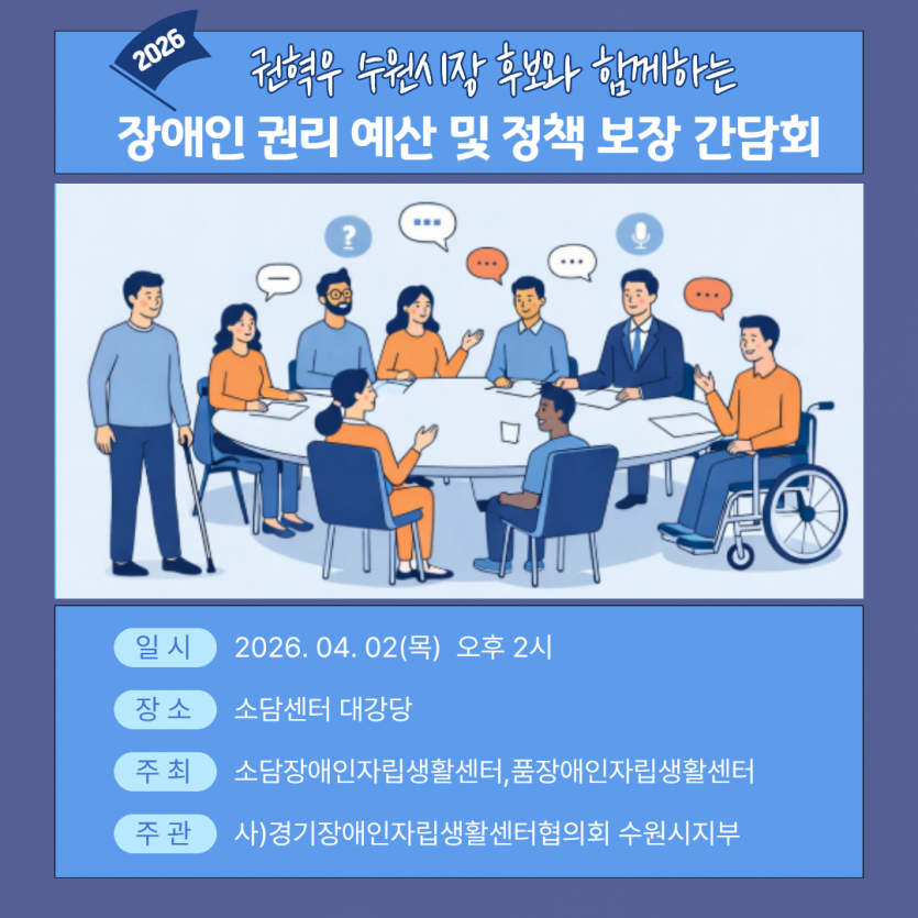 권혁우 수원시장 후보과 함께하는 장애인 권리 예산 및 정책 보장 간담회가 열립니다.