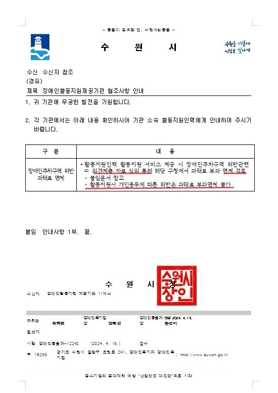 장애인 주차구역 과태료에 대한 안내(보행장애 이용자 활동지원 근무 중 발생분 면제 검토)