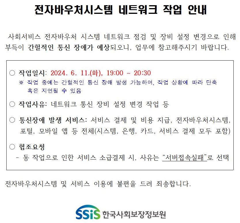 전자바우처시스템 네트워크 작업 안내 페이지 정보 작성자 소담센터 댓글 0건 조회 483회 작성일 24-06-04 10:03 본문 근무에 참고 하시길 바랍니다. 목록 이전글장애인활동지원 부정수급에 대한 지자체 협조 안내 24.06.10 다음글2024년 5월 활동지원사 월례교육 24.05.28 댓글목록 댓글목록 등록된 댓글이 없습니다.
