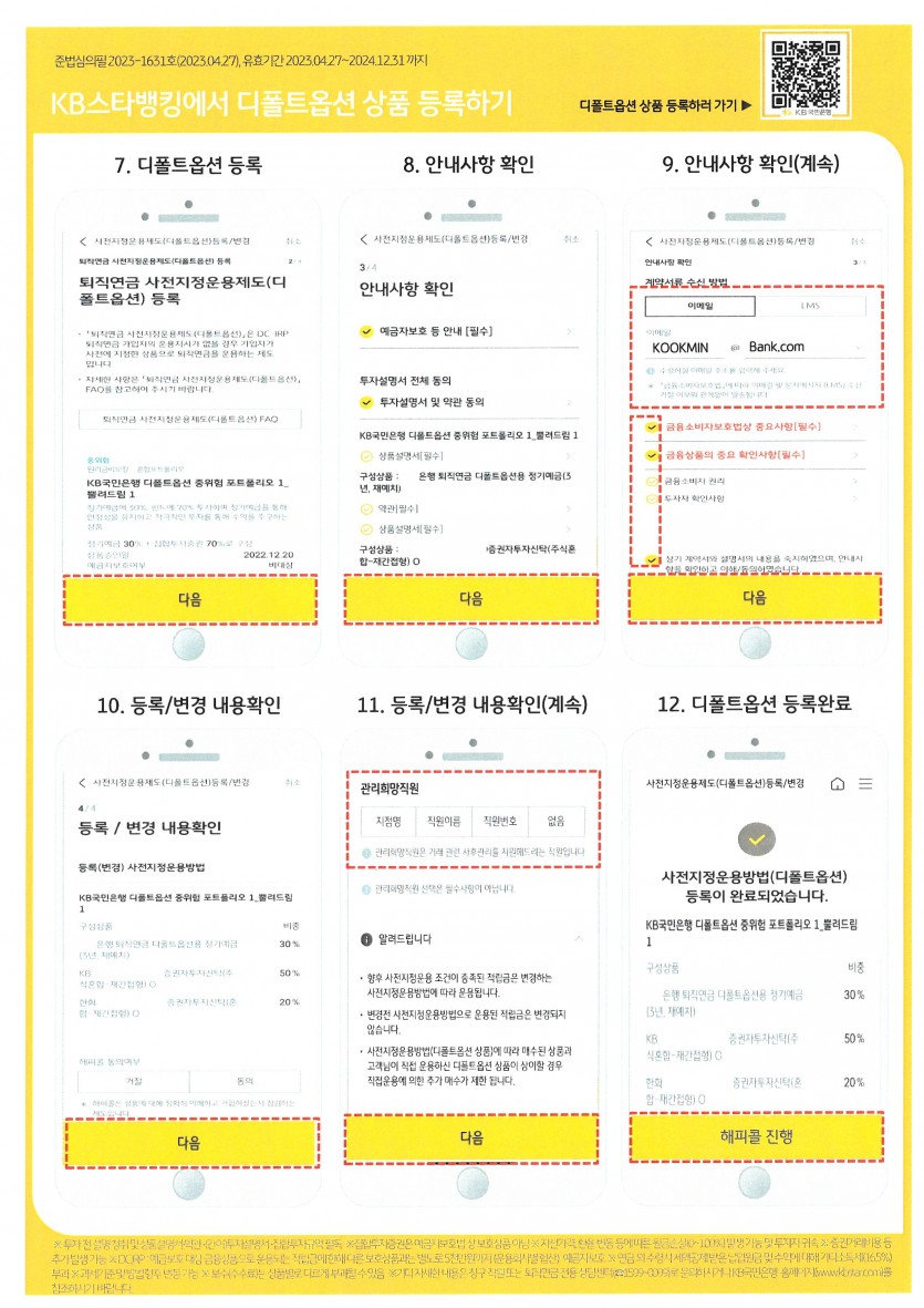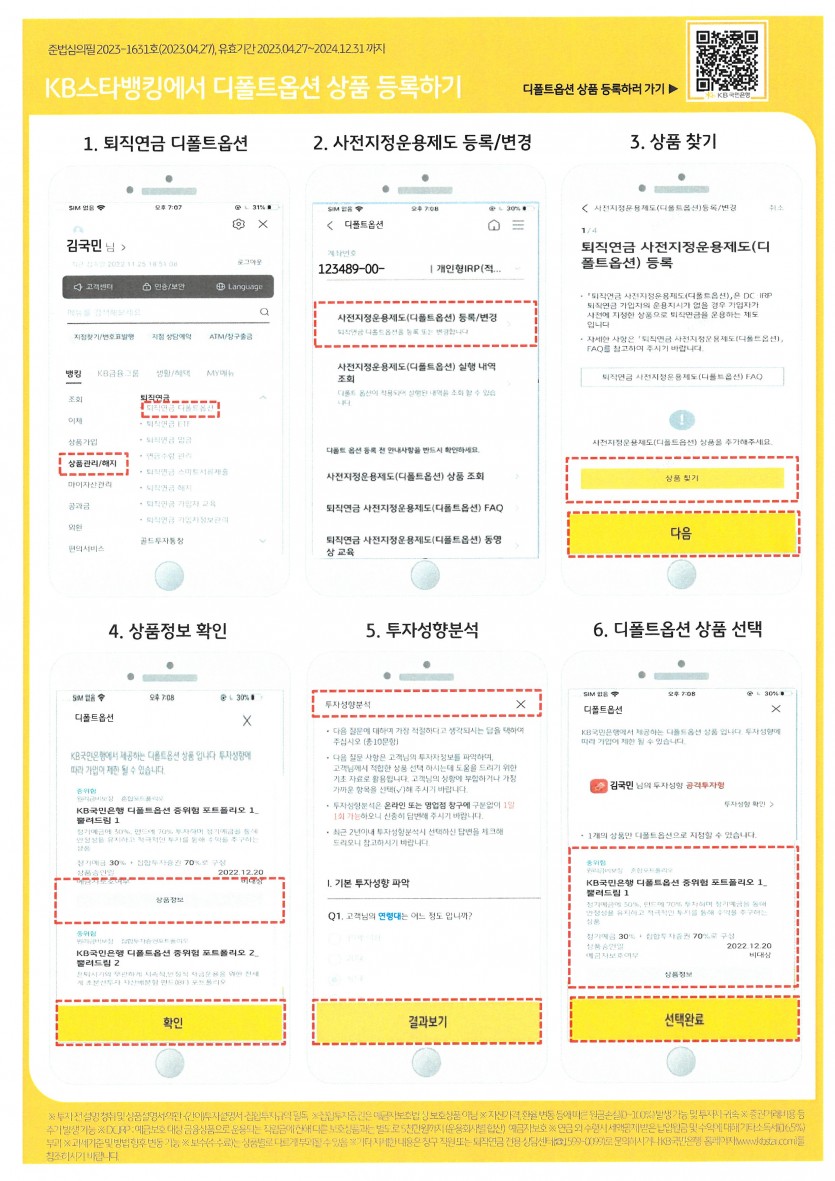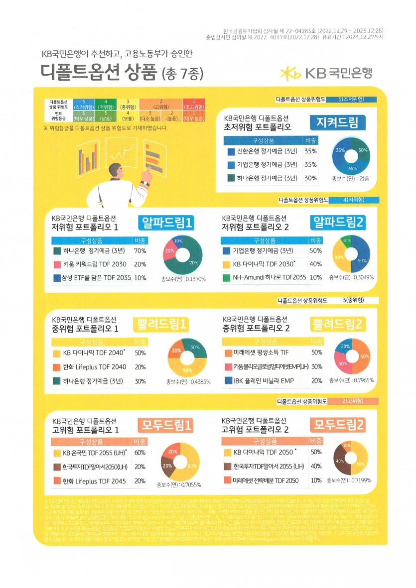 퇴직연금 상품에 대한 문의는 국민은행 1599 - 0099 또는 가까운 국민은행 지점 방문 문의 후 상품지정