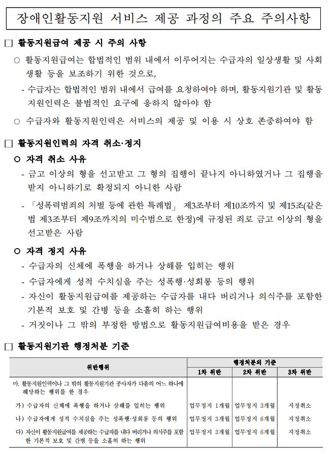 장애인 활동지원서비스 제공시 주의사항 안내
