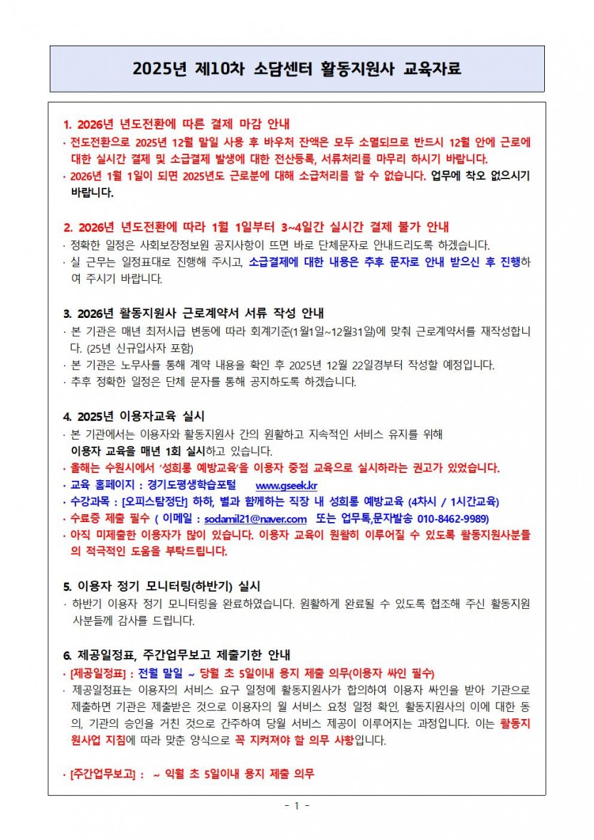 2025년 12월 활동지원 월례교육 페이지 정보 작성자 소담센터 댓글 7건 조회 167회 작성일 25-12-24 16:44 본문 반드시 댓글을 작성하셔야 읽으신 것으로 인정됩니다. 추운날씨 감기 조심하시고, 건강 유의하시기 바랍니다. 목록 이전글2026년 1월 부정수급예방교육 26.01.14 다음글2025년 12월 부정수급예방교육 25.12.10 댓글목록 댓글목록 한경자님의 댓글 한경자 작성일 25-12-24 18:55 확인했습니다. 답변 삭제 확인했습니다. 지민정님의 댓글 지민정 작성일 26-01-14 14:12 확인했습니다 답변 삭제 확인했습니다 나종선님의 댓글 나종선 작성일 26-01-14 14:55 확인했습니다. 답변 삭제 확인했습니다. 나종선님의 댓글 나종선 작성일 26-01-14 14:56 확인했습니다. 답변 삭제 확인했습니다. 김미순님의 댓글 김미순 작성일 26-01-15 15:29 댓글내용 확인 답변 삭제 비밀글 입니다. 이춘애님의 댓글 이춘애 작성일 26-01-17 02:47 확인했습니다 답변 삭제 확인했습니다 김윤희님의 댓글 김윤희 작성일 26-01-22 19:03 확인합니다. 답변 삭제 확인합니다.