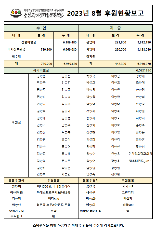 2023년 8월 후원현황보고서 페이지 정보 작성자 소담센터 댓글 0건 조회 359회 작성일 23-10-05 11:21 본문 소중한 후원 감사드립니다. (_ _) 목록 이전글2023년 9월 후원현황보고서 23.10.24 다음글2023년 7월 후원현황보고서 23.08.16 댓글목록 댓글목록 등록된 댓글이 없습니다.