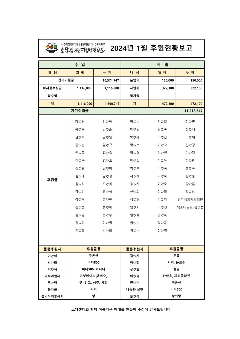 2024년 1월 후원현황보고서 페이지 정보 작성자 소담센터 댓글 0건 조회 370회 작성일 24-02-05 17:23 본문 소중한 후원 감사드립니다. (_ _) 목록 이전글2024년 2월 후원현황보고서 24.03.04 다음글2023년 12월 후원현황보고서 24.01.05 댓글목록 댓글목록 등록된 댓글이 없습니다.