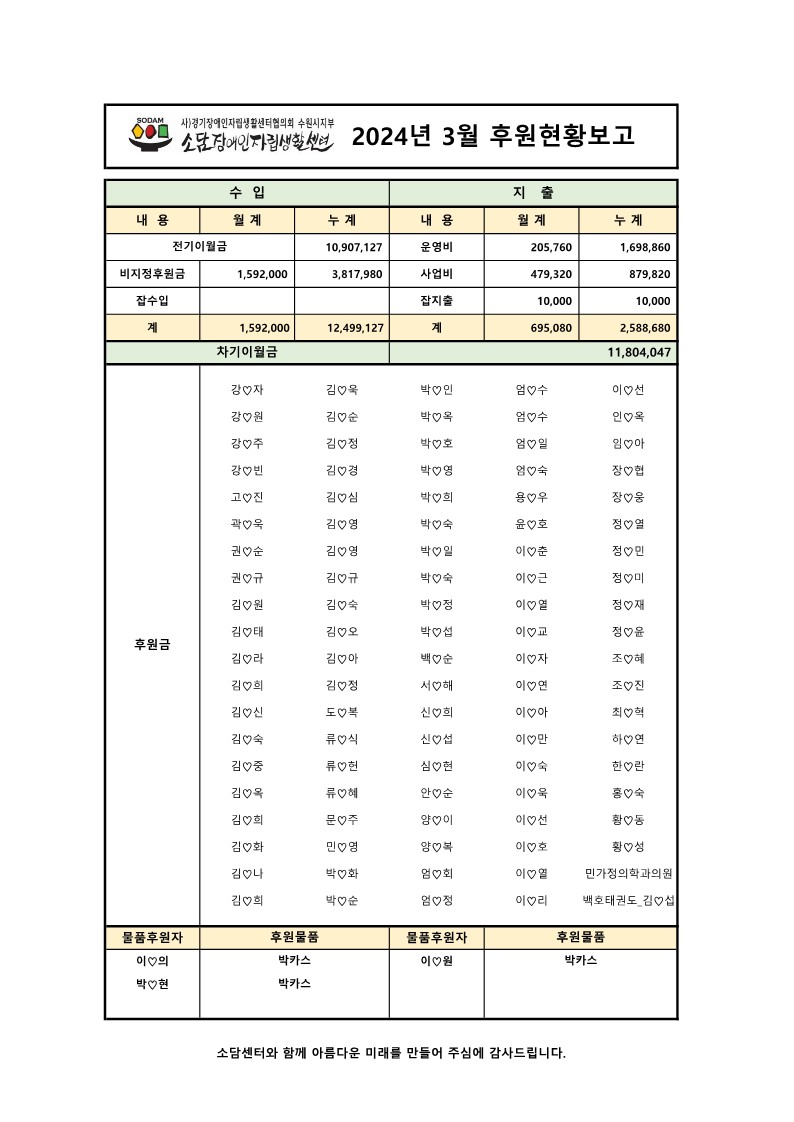 2024년 3월 후원현황보고서 페이지 정보 작성자 소담센터 댓글 0건 조회 354회 작성일 24-04-02 10:26 본문 함께 꿈을 이루어갑니다 목록 이전글2024년 4월 후원현황보고서 24.05.02 다음글2024년 2월 후원현황보고서 24.03.04 댓글목록 댓글목록 등록된 댓글이 없습니다.