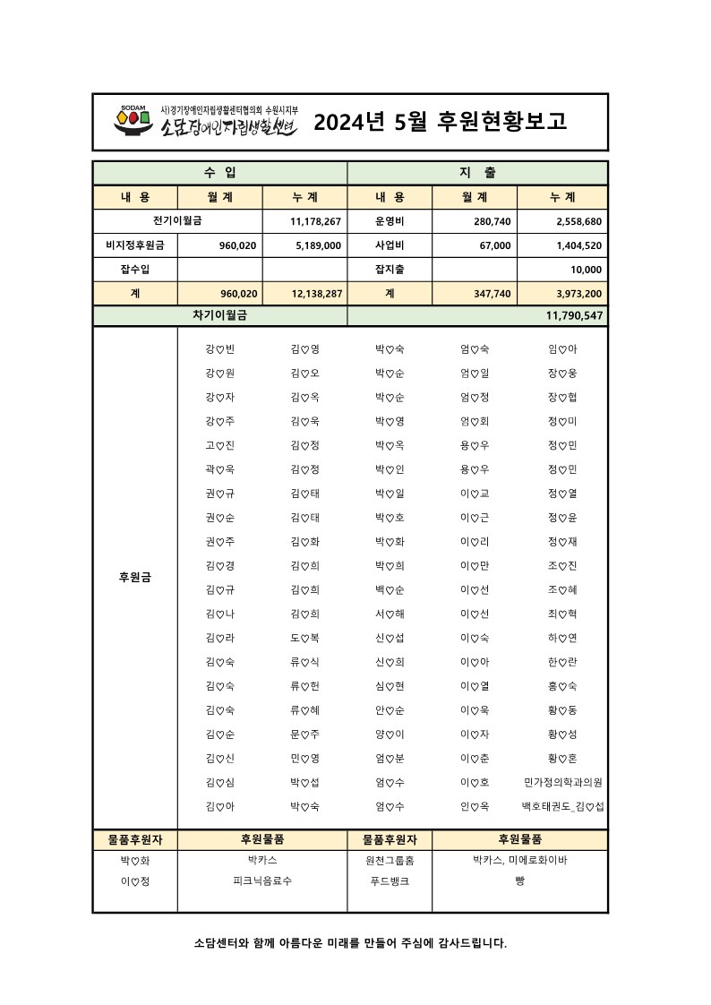 2024년 5월 후원현황보고서 페이지 정보 작성자 소담센터 댓글 0건 조회 348회 작성일 24-06-05 17:33 본문 함께 꿈을 이루어갑니다 목록 이전글2024년 6월 후원현황보고서 24.07.02 다음글2024년 4월 후원현황보고서 24.05.02 댓글목록 댓글목록 등록된 댓글이 없습니다.