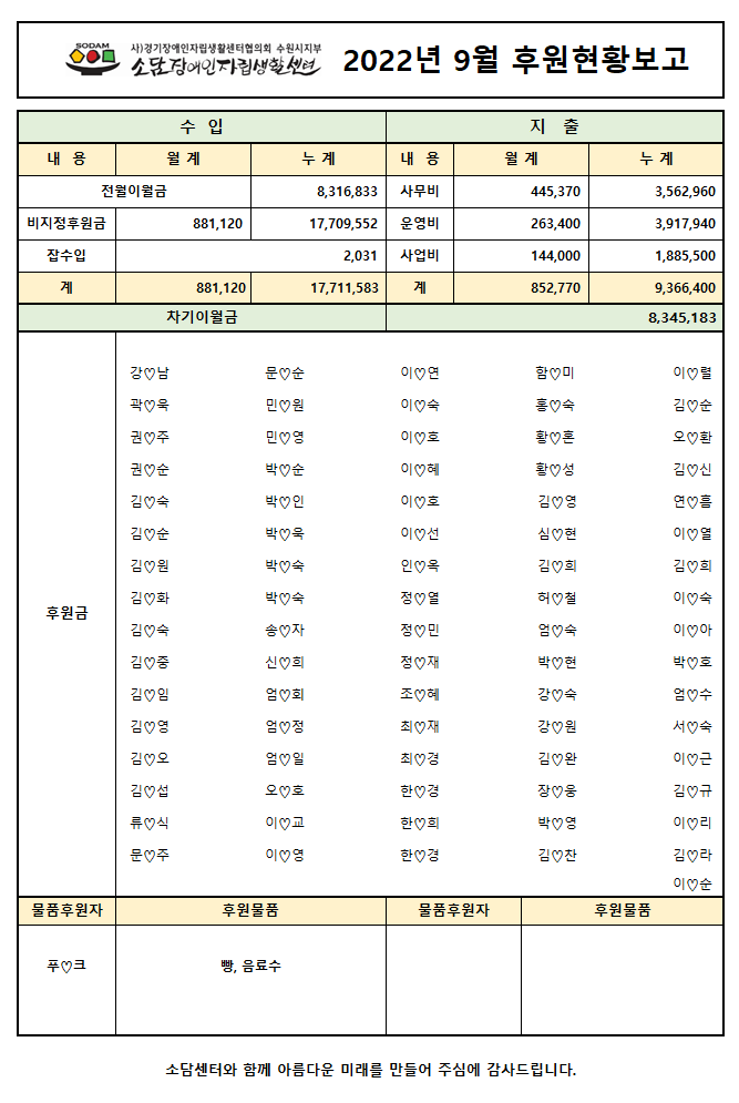 2022년 9월 후원현황보고서 페이지 정보 작성자 소담센터 댓글 0건 조회 362회 작성일 22-10-25 17:03 본문 소중한 후원 감사드립니다 목록 이전글2022년 10월 후원현황보고서 22.11.10 다음글2022년 8월 후원현황 보고서 22.09.06 댓글목록 댓글목록 등록된 댓글이 없습니다.
