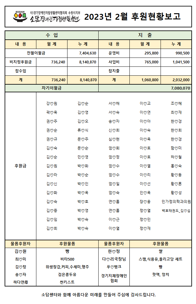 2023년 2월 후원현황보고서 페이지 정보 작성자 소담센터 댓글 0건 조회 361회 작성일 23-03-09 18:32 본문 소중한 후원 감사드립니다. (_ _) 목록 이전글2023년 3월 후원현황보고서 23.04.12 다음글2023년 1월 후원현황보고서 23.03.09 댓글목록 댓글목록 등록된 댓글이 없습니다.
