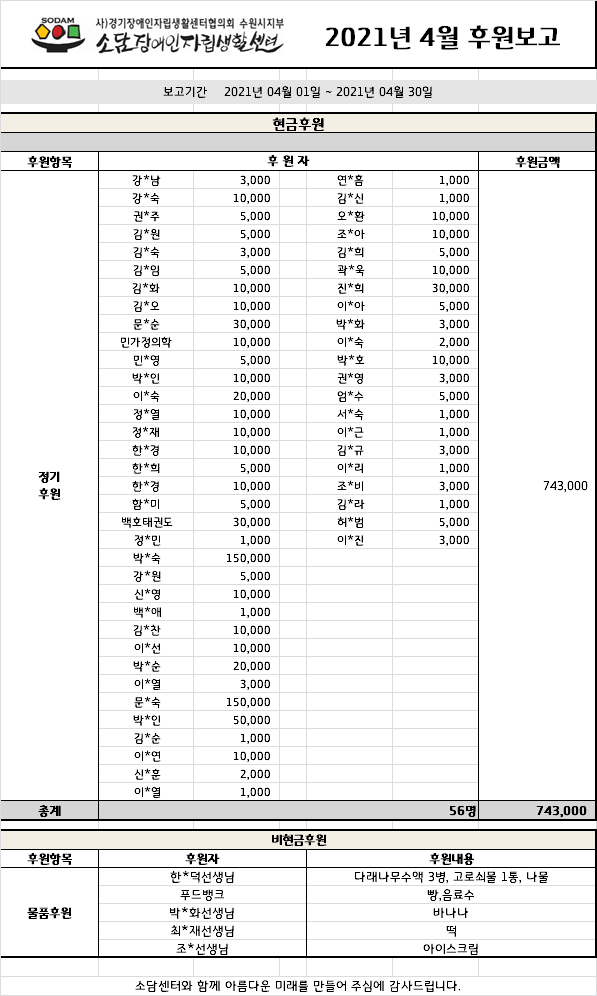 2021년 4월 후원보고서 페이지 정보 작성자 소담센터 댓글 0건 조회 696회 작성일 21-07-14 17:05 본문 소중한 후원에 감사드립니다. 목록 이전글2021년 5월 후원보고서 21.07.14 다음글2021년 3월 후원보고서 21.04.13 댓글목록 댓글목록 등록된 댓글이 없습니다.