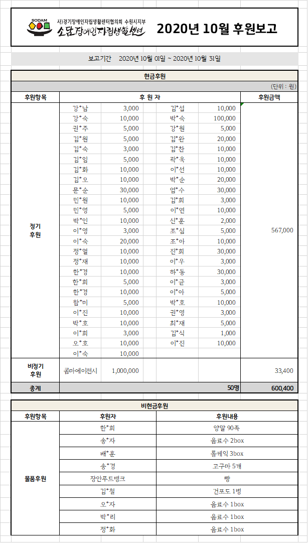 2020년 10월 후원보고서 페이지 정보 작성자 소담센터 댓글 0건 조회 739회 작성일 21-01-11 11:58 본문 후원해주신 모든 분들께 감사드립니다. 앞으로 더 열심히 활동하는 소담센터가 되겠습니다. 목록 이전글2020년 11월 후원보고서 21.01.11 다음글2020년 09월 후원보고서 21.01.11 댓글목록 댓글목록 등록된 댓글이 없습니다.