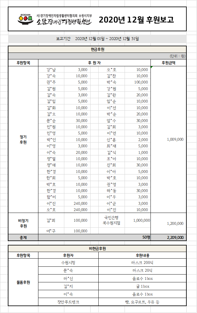 2020년 12월 후원보고서 페이지 정보 작성자 소담센터 댓글 0건 조회 841회 작성일 21-01-11 12:00 본문 후원해주신 모든 분들께 감사드립니다. 앞으로 더 열심히 활동하는 소담센터가 되겠습니다. 목록 이전글2021년 1월 후원보고서 21.04.13 다음글2020년 11월 후원보고서 21.01.11 댓글목록 댓글목록 등록된 댓글이 없습니다.