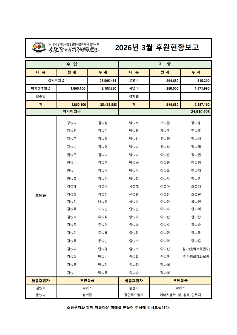 2026년 3월 후원현황보고서 페이지 정보 작성자 소담센터 댓글 0건 조회 1회 작성일 26-04-01 13:56 본문 함께 꿈을 만들어 갑니다 목록 다음글2026년 2월 후원현황보고서 26.03.04 댓글목록 댓글목록 등록된 댓글이 없습니다.