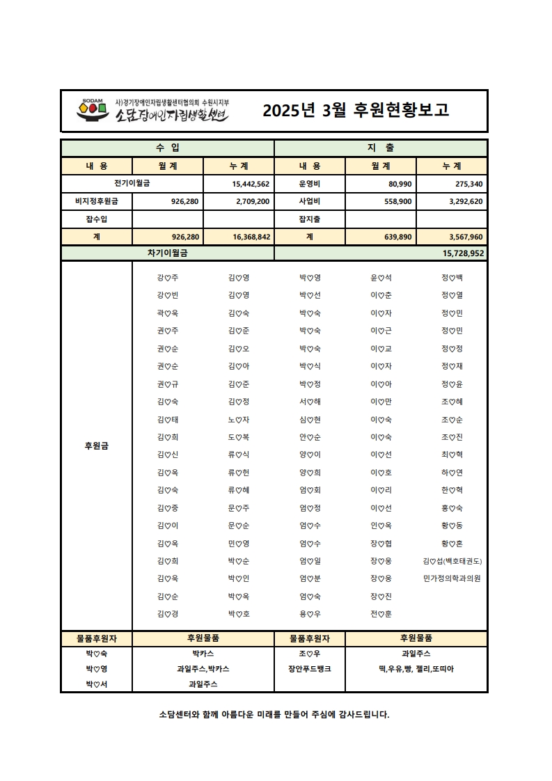 2025년 3월 후원현황보고서 페이지 정보 작성자 소담센터 댓글 0건 조회 128회 작성일 25-04-07 13:09 본문 함께 꿈을 이루어 갑니다 목록 이전글2025년 4월 후원현황보고서 25.05.12 다음글2025년 2월 후원현황보고서 25.03.04 댓글목록 댓글목록 등록된 댓글이 없습니다.