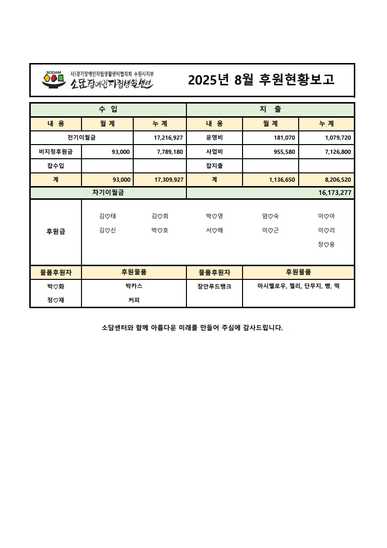 2025년 8월 후원현황보고서 페이지 정보 작성자 소담센터 댓글 0건 조회 58회 작성일 25-09-03 14:18 본문 함께 꿈을 이루어 갑니다 목록 이전글2025년 9월 후원현황보고서 25.10.02 다음글2025년 7월 후원현황보고서 25.08.05 댓글목록 댓글목록 등록된 댓글이 없습니다.