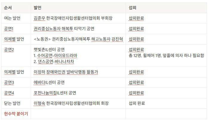 1118 장애인권리예산 집중투쟁 결의대회 페이지 정보 작성자 소담센터 댓글 4건 조회 439회 작성일 25-11-19 10:12 본문 28일 예정되었던 장애권리페스티벌 대신 집중결의대회로 참여하여 권리 예산투쟁을 진행했습니다. 목록 이전글1114 -제3회 소담 북콘서트- 25.11.19 다음글1113 시흥시 발달장애인 문화예술페스티벌 공연참여 25.11.18 댓글목록 댓글목록 정석민님의 댓글 정석민 작성일 25-11-19 22:35 소담센터 파이팅!!!! 답변 삭제 소담센터 파이팅!!!! 김기태님의 댓글 김기태 작성일 25-11-20 17:43 한 몸 바쳐서 투쟁 투쟁 보장 해라 답변 삭제 한 몸 바쳐서 투쟁 투쟁 보장 해라 나수영님의 댓글 나수영 작성일 25-11-23 19:53 화이팅입니다 답변 삭제 화이팅입니다 이영숙님의 댓글 이영숙 작성일 25-11-28 22:28 소담 센타 화이팅 입니다 답변 삭제 소담 센타 화이팅 입니다