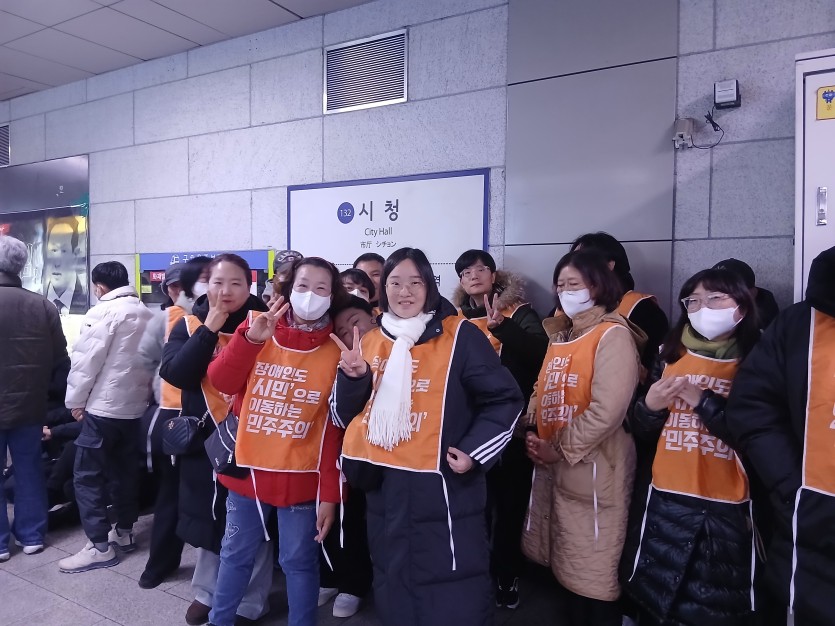 1209 12345 지하철 선전전 - 서울시청 페이지 정보 작성자 소담센터 댓글 3건 조회 380회 작성일 25-12-12 17:49 본문 2001년 오이도 리프트 추락사로 시작된 이동권 투쟁의 역사를 이어 오늘도 소담의 권리중심참여자들은 가열차게 이동권 투쟁을 펼쳤습니다. 목록 이전글1212 독서심리교육-마지막수업 25.12.12 다음글1211 AI 창작 발달장애인 독립예술 가무극 성과발표회 초청공연 참여 25.12.12 댓글목록 댓글목록 김기태님의 댓글 김기태 작성일 25-12-12 23:44 보장받는 시민으로 투쟁 투쟁 하고 왔습니다 답변 삭제 보장받는 시민으로 투쟁 투쟁 하고 왔습니다 이영숙님의 댓글 이영숙 작성일 25-12-14 22:08 시청에서 모였습니다 이동권 앞세워 보장받는 투쟁입니다 소담 화이팅 입니다 답변 삭제 시청에서 모였습니다 이동권 앞세워 보장받는 투쟁입니다 소담 화이팅 입니다 정석민님의 댓글 정석민 작성일 25-12-17 12:37 장애인도 시민으로 이동하는 민주주의 투쟁을 다함께 외치시느라 수고 많으셨습니다~ 답변 삭제 장애인도 시민으로 이동하는 민주주의 투쟁을 다함께 외치시느라 수고 많으셨습니다~