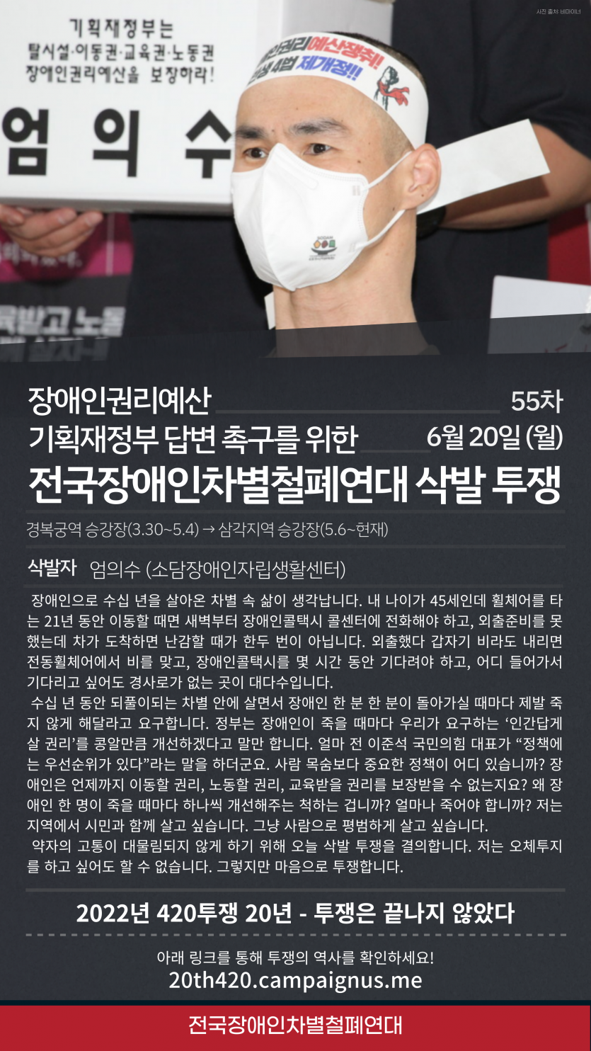 장애인권리예산 기획재정부 답변 촉구를 위한 전국장애인차별철폐연대 삭발 투쟁 55일차 페이지 정보 작성자 소담센터 댓글 0건 조회 523회 작성일 22-06-21 14:49 본문 목록 이전글2022.05.23 카카오톡 이모티콘만들기 22.06.23 다음글장애인권리보장법・탈시설지원법 제정 촉구 여의도 농성 463일차 22.06.21 댓글목록 댓글목록 등록된 댓글이 없습니다.