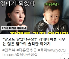 1028 “알고도 낳았냐구요?” 장애아이를 키우는 젊은 엄마의 솔직한 이야기 페이지 정보 작성자 소담센터 댓글 0건 조회 91회 작성일 25-10-28 10:38 본문 “알고도 낳았냐구요?” 장애아이를 키우는 젊은 엄마의 솔직한 이야기 - https://youtube.com/watch?v=9eO29StOXAs&si=cERLopBwjN1qswjE 목록 이전글1111 발달장애인시회공헌사절단 "댄스예그리나" 성과발표회 25.11.18 다음글1028 이어령 < 정말 그럴 때가 > 25.10.28 댓글목록 댓글목록 등록된 댓글이 없습니다.