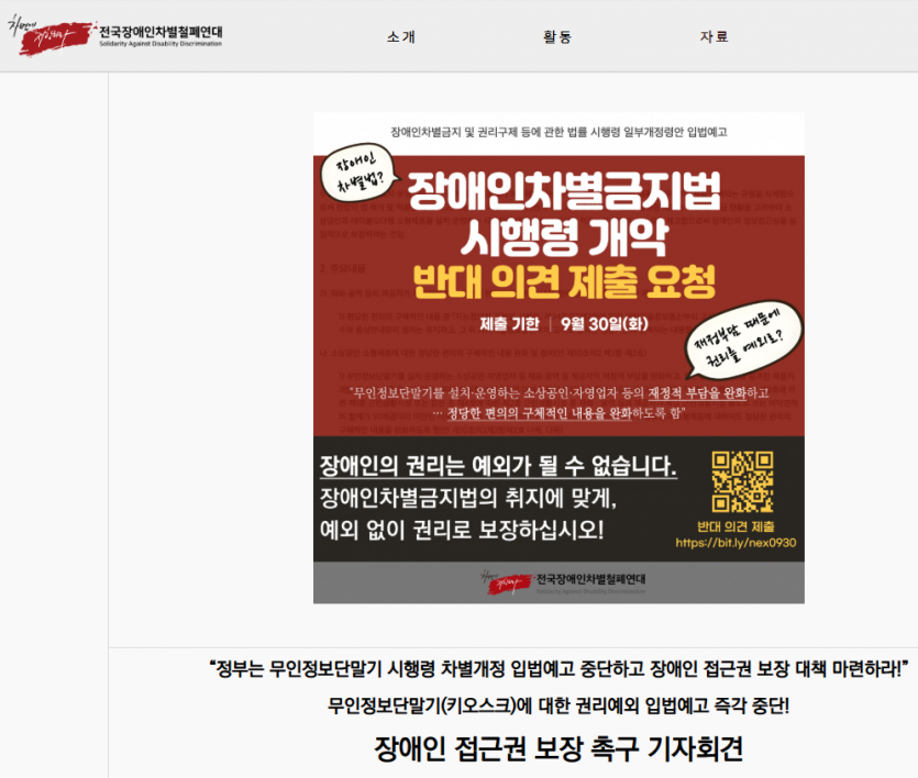 이미 50제곱미터 면적 이하는 예외를 두는 시행령을 2023년 정부는 일방적으로 개정한 바 있습니다. 더불어 소상공인 등을 고려, 그 시행을 3년으로 단계적 시행한 바 있습니다. 그러함에도 불구하고 3년이 지난 지금 또다시 소상공인과 자영업자들의 어려움을 핑계로 시행령을 추가적으로 완화, 개정하려는 것은 그동안의 정부의 무책임한 행정으로 인한 모든 고통과 권리박탈을 장애인에게 전가하는 몰염치한 행정정책입니다.