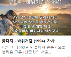 0903 꽃다지 - 바위처럼 (1994). 가사 페이지 정보 작성자 소담센터 댓글 1건 조회 143회 작성일 25-09-03 13:31 본문 - https://youtube.com/watch?v=gEQJhcsnjKs&feature=shared 목록 이전글1017 2025년 인플루엔자 ( 독감) 예방접종 안내 25.10.17 다음글0903 발달장애인의 반짝이는 재능과 꿈을 담은 나눔송 “하나, 둘, 셋” 25.09.03 댓글목록 댓글목록 김기태님의 댓글 김기태 작성일 25-09-05 18:42 노래 최고 짱......소담 센터 포에버.. 답변 삭제 노래 최고 짱......소담 센터 포에버..