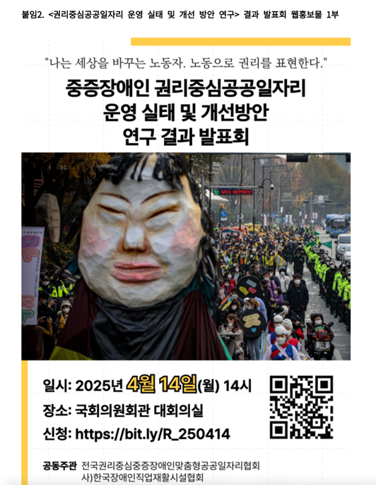 0411 04월 14일 권리중심 일자리 운영 실태 및 개선 방안 연구 결과 발표회가 열립니다. 페이지 정보 작성자 소담센터 댓글 0건 조회 185회 작성일 25-04-11 17:32 본문 1500여명의 전국 권리중심 일자리 노동자들의 적극적인 참석 요청드립니다. 목록 이전글0418 2025 경기420장애인차렵철폐 공동투쟁단 출범결의대회 Disability Pride 진행 25.04.18 다음글0328 지적장애인들의 품위 있는 삶과 가치의 유산 ‘지적장애인의 삶과 유산’ 출간 25.03.28 댓글목록 댓글목록 등록된 댓글이 없습니다.