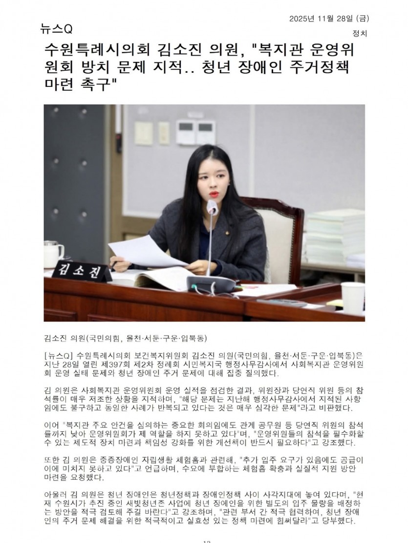 (중앙뉴스타임스 = 방재영 기자) 수원특례시의회 보건복지위원회 김소진 의원(국민의힘, 율천·서둔·구운·입북동)은 28일 열린 제397회 제2차 정례회 시민복지국 행정사무감사에서 사회복지관 운영위원회 운영 실태 문제와 청년 장애인 주거 문제에 대해 집중 질의했다.