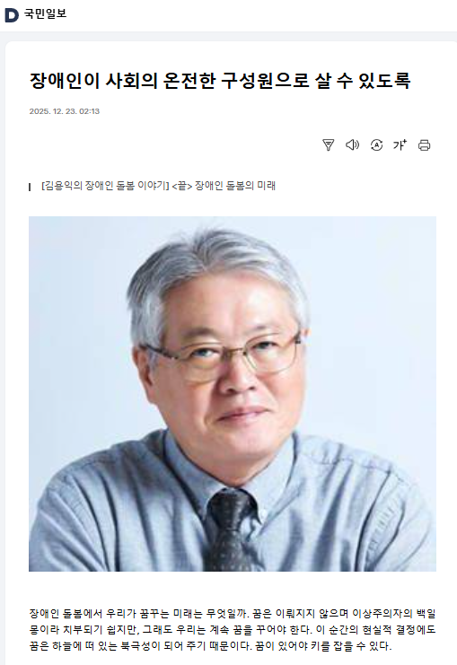 1226 장애인이 사회의 온전한 구성원으로 살 수 있도록 - 국민일보 페이지 정보 작성자 소담센터 댓글 0건 조회 56회 작성일 25-12-26 14:37 본문 https://v.daum.net/v/20251223021349655 목록 이전글1202 전세계 최초 장애인문학 " 솟대문학 " 세계가 주목하고 있다? 26.01.04 다음글1224 생애주기별 맞춤 가족교육 확대 추진…주 4.5일제 시행 검토 SBS Biz 25.12.26 댓글목록 댓글목록 등록된 댓글이 없습니다.