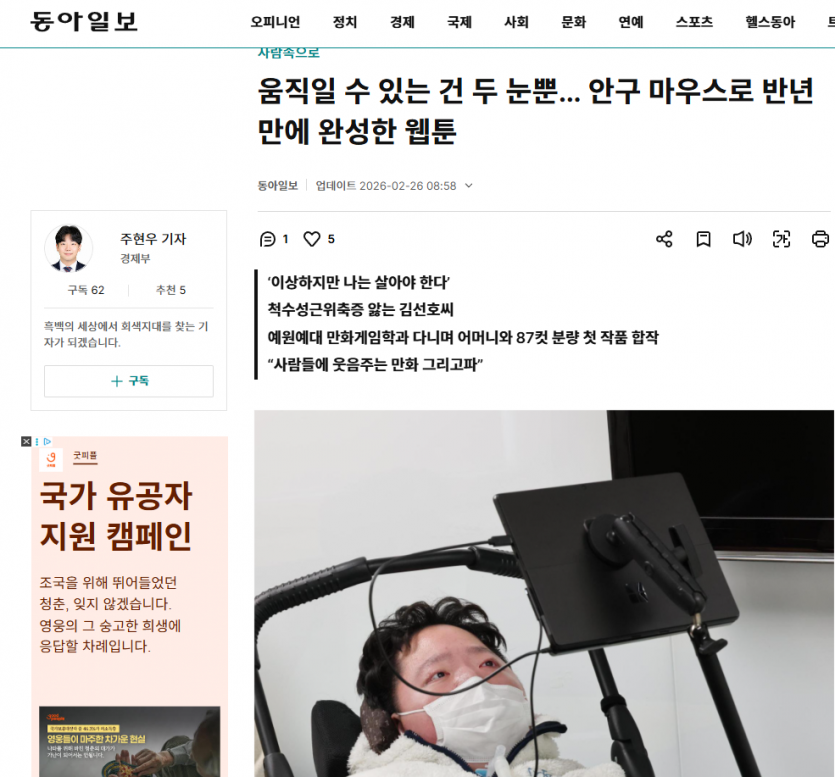 0227 움직일 수 있는 건 두 눈뿐… 안구 마우스로 반년 만에 완성한 웹툰 페이지 정보 작성자 소담센터 댓글 0건 조회 80회 작성일 26-03-03 09:34 본문 https://www.donga.com/news/People/article/all/20260226/133424900/2 목록 이전글0301 “뇌에 칩 이식”…시각장애 한국인 유튜버, 머스크 임상 실험 지원 26.03.03 다음글0222 ‘성폭력 의혹’색동원 전 시설장 구속 영장 심사 KBS 26.02.22 댓글목록 댓글목록 등록된 댓글이 없습니다.