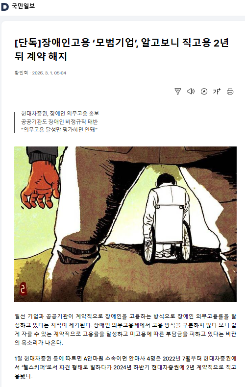 0302 [단독]장애인고용 ‘모범기업’, 알고보니 직고용 2년 뒤 계약 해지 페이지 정보 작성자 소담센터 댓글 1건 조회 160회 작성일 26-03-03 09:41 본문 https://v.daum.net/v/20260301050401950 목록 이전글0303 아파도 병원 못 가는 일 없게…첫 장애인 건강계획 나왔다 26.03.03 다음글0301 “뇌에 칩 이식”…시각장애 한국인 유튜버, 머스크 임상 실험 지원 26.03.03 댓글목록 댓글목록 정석민님의 댓글 정석민 작성일 26-03-03 16:38 소담센터 파이팅!!! 답변 삭제 소담센터 파이팅!!!