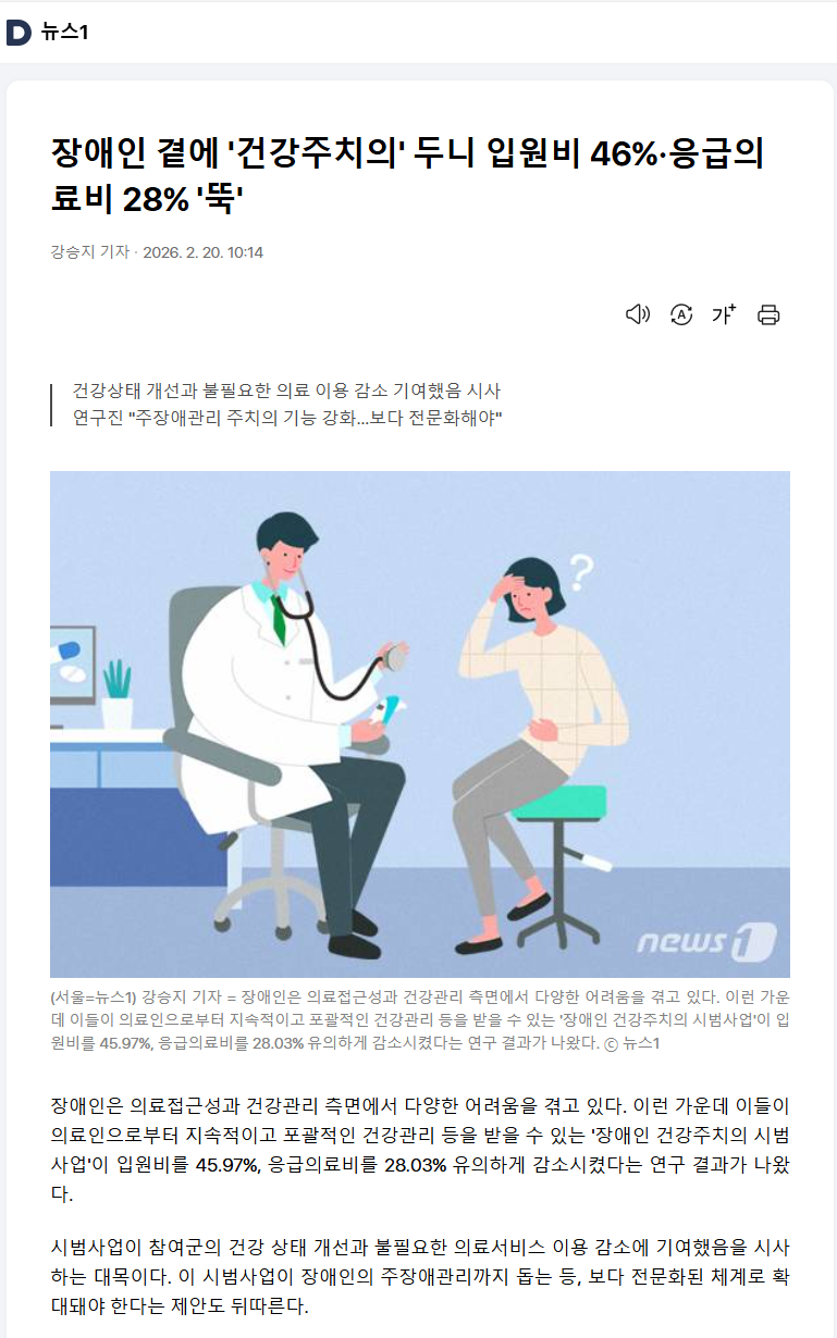 0221 장애인 곁에 '건강주치의' 두니 입원비 46%·응급의료비 28% '뚝' 출처: Daum