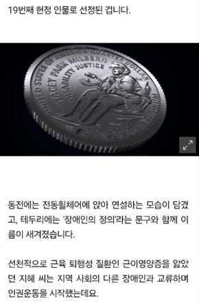 동전에는 전동휠체어에 앉아 연설하는 모습이 담겼고, 테두리에는 '장애인의 정의'라는 문구와 함께 이름이 새겨졌습니다.