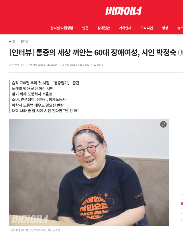 0822 시인 박정숙 통증 앞에 나를 세우다. 통증일기 페이지 정보 작성자 소담센터 댓글 0건 조회 132회 작성일 25-08-22 15:25 본문 https://www.beminor.com/news/articleView.html?idxno=28224 목록 이전글0903 지역사회 통합돌봄시대 개인별 주거를 위한, '지원주택법' 토론회 지원주택10만호공급공동대책위원회(이하 ‘지원주택10만호공대위’) 제출 25.09.03 다음글0812 휠체어 앉아 연설…미 동전에 새겨진 한국계 인권운동가 SBS 25.08.12 댓글목록 댓글목록 등록된 댓글이 없습니다.