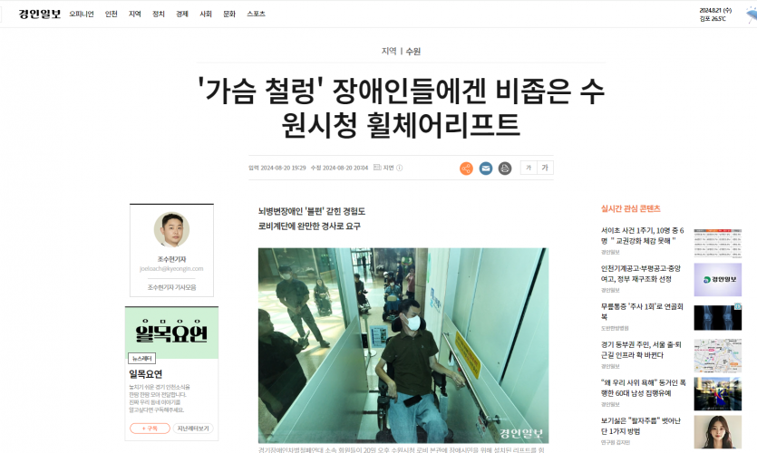 0821 '가슴 철렁' 장애인들에겐 비좁은 수원시청 휠체어리프트 페이지 정보 작성자 소담센터 댓글 0건 조회 339회 작성일 24-08-21 10:13 본문 http://www.kyeongin.com/main/view.php?key=20240821010002179 목록 이전글0902 계단 오르고 바위 넘는 바퀴 ' 세계 최초 개발 ' 24.09.03 다음글0807 중증와상장애인에게 6배 요금부과 대한항공 규탄 기자회견 24.08.09 댓글목록 댓글목록 등록된 댓글이 없습니다.