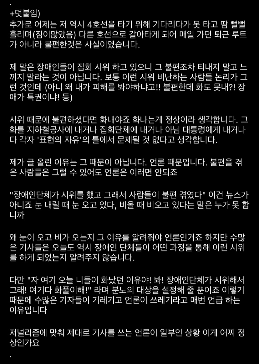 제발은 장애인들이 집회 시위 하고 있으니 그 불편조차 티내지 말고 느끼지 말라는 것이 아닙니다. 보통 이런 시위 비난하는 사람들 논리가 그런것인데 (아니 왜 내가 피해를 봐야하냐고!! 불편한데 화도 못내?! 장애가 특권이냐! 등)