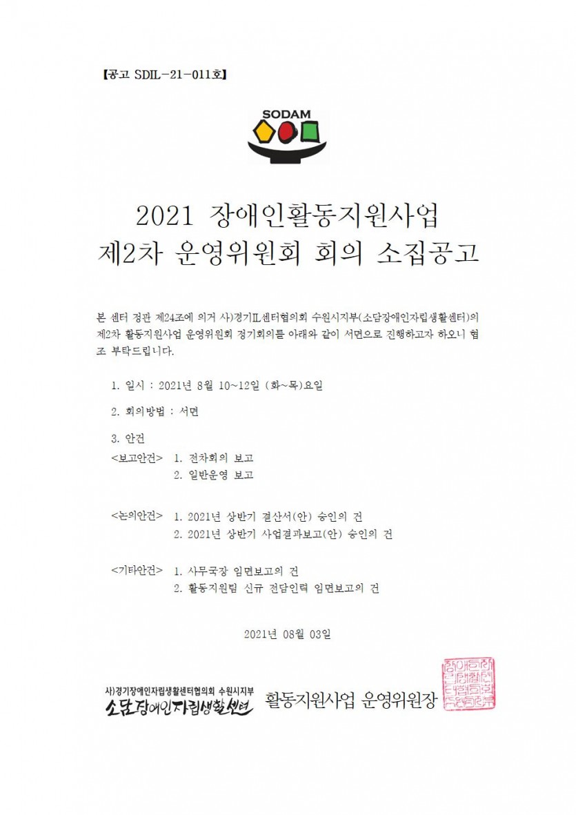 2021 장애인활동지원사업제 2차 운영위원회 회의 소집공고 페이지 정보 작성자 소담센터 댓글 0건 조회 1,373회 작성일 21-08-03 17:08 본문 . 목록 이전글2021.2차 임시운영위원회_1차 추경예산안 회의공고 21.09.24 다음글활동지원사업 전담인력 2차 채용 최종합격자 공지 21.07.22 댓글목록 댓글목록 등록된 댓글이 없습니다.