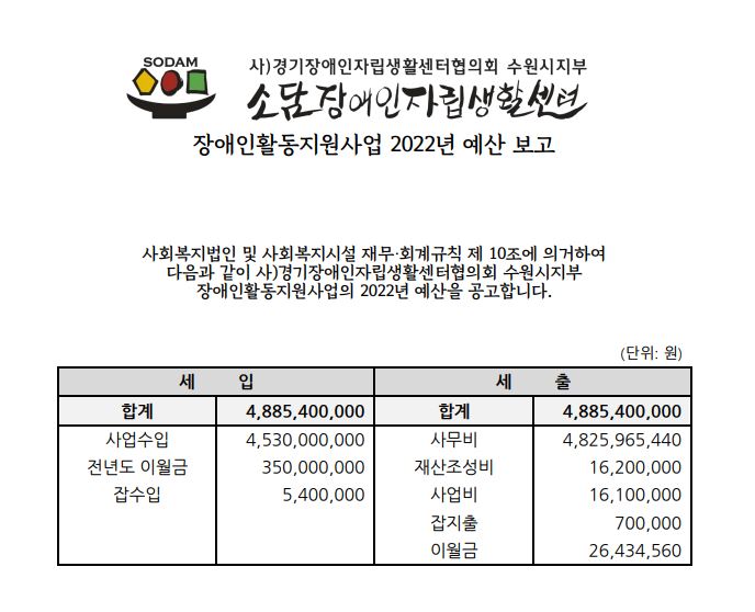 사)경기장애인자립생활센터협의회 수원시지부 장애인활동지원사업 2022년 본예산서를 공고합니다.