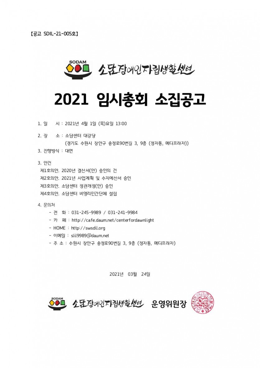 2021 소담센터 임시총회 소집공고 페이지 정보 작성자 소담센터 댓글 0건 조회 1,358회 작성일 21-03-24 18:15 본문 공고문과 같이 임시총회를 개최합니다. 목록 이전글[체험홈 코디네이터 채용] 최종합격자 공지 21.03.26 다음글[체험홈 코디네이터 채용] 서류전형 합격자발표 21.03.23 댓글목록 댓글목록 등록된 댓글이 없습니다.