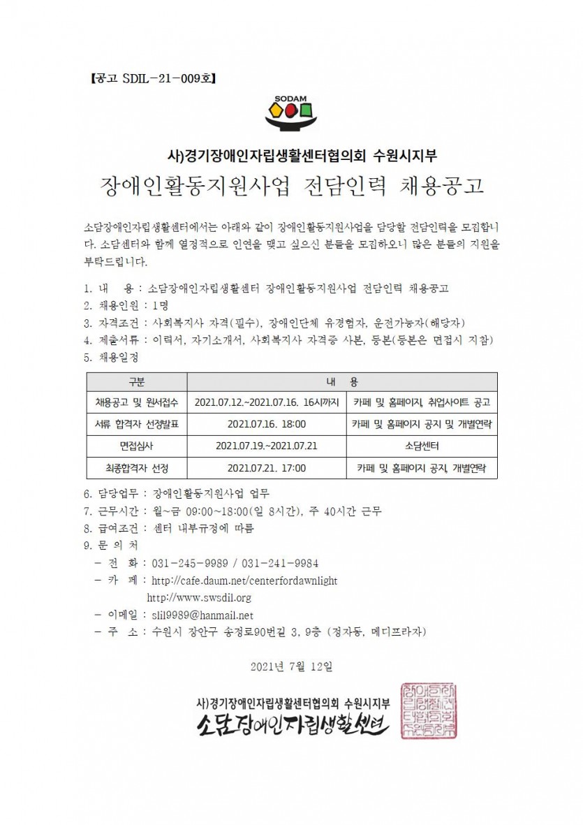 활동지원사업 전담인력 2차 채용공고문 페이지 정보 작성자 소담센터 댓글 0건 조회 1,412회 작성일 21-07-12 16:03 본문 . 목록 이전글2021 제3차 운영위원회 회의 소집공고 21.07.16 다음글[장애인활동지원 코디네이터 채용] 최종합격자 공지 21.07.09 댓글목록 댓글목록 등록된 댓글이 없습니다.