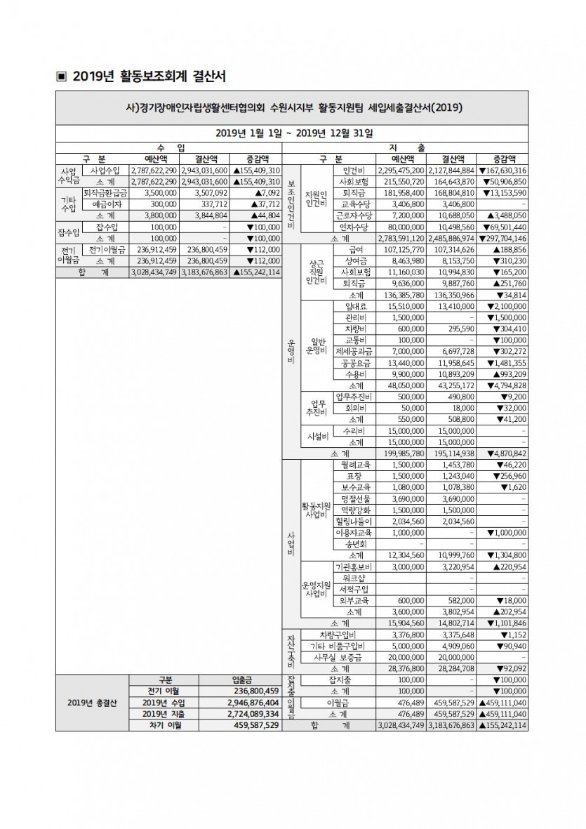 2019년 활동지원회계 결산서 페이지 정보 작성자 소담센터 댓글 0건 조회 1,734회 작성일 20-03-12 15:04 본문 2019년 활동지원사업에 대한 회계결산서 공유합니다. 목록 이전글2019년 일반회계 결산서 20.03.12 다음글2019년 체험홈회계 결산서 20.03.12 댓글목록 댓글목록 등록된 댓글이 없습니다.