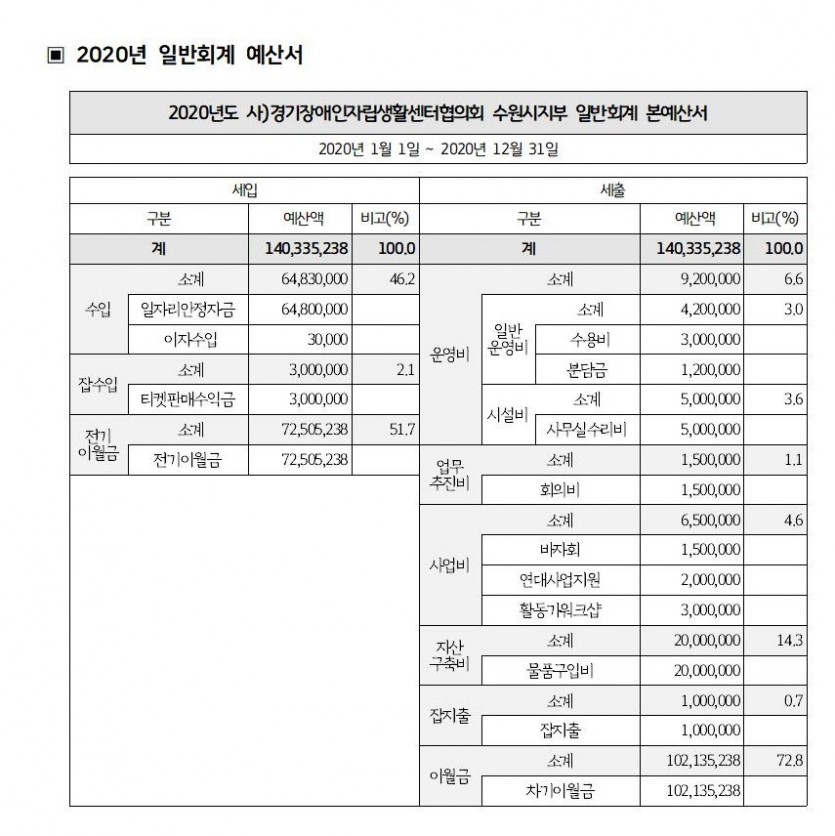 2020년 예산서 페이지 정보 작성자 소담센터 댓글 0건 조회 2,135회 작성일 20-03-12 15:15 본문 2020년 총회를 통해 승인된 각 예산별 예산서 공유합니다. 열심히 활동하는 소담센터가 되겠습니다. 목록 이전글장애인식개선 동화책 e-book 발간 20.03.12 다음글2019년 일반회계 결산서 20.03.12 댓글목록 댓글목록 등록된 댓글이 없습니다.