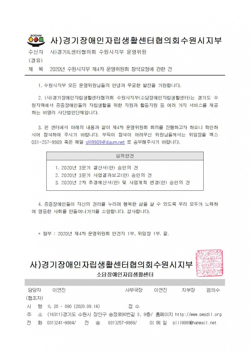 2020년 소담IL센터 4차 운영위회 회의 소집 공고 페이지 정보 작성자 소담센터 댓글 0건 조회 1,948회 작성일 20-09-15 09:53 본문 회원님 모두 코로나 건강유의하십시요. 목록 이전글소담센터 코로나19 극복 물품지원 신청받습니다 20.11.20 다음글재난기본소득신청안내 20.04.10 댓글목록 댓글목록 등록된 댓글이 없습니다.