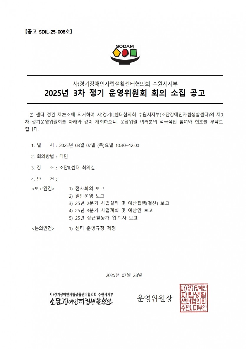 2025년 자립생활지원사업 3분기 정기 운영위원회 개최의 건 페이지 정보 작성자 소담센터 댓글 0건 조회 320회 작성일 25-07-29 17:20 본문 . 목록 이전글2025년 활동지원사업 제3차 정기 운영위원회 개최의 건 25.07.31 다음글2025년 활동지원팀 신입 사회복지사 추가 채용 합격자 발표 25.07.28 댓글목록 댓글목록 등록된 댓글이 없습니다.
