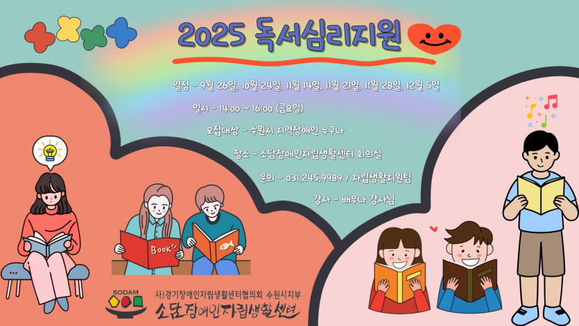 0804 (2025년 독서심리지원 참여자를 모집합니다.) 페이지 정보 작성자 소담센터 댓글 0건 조회 323회 작성일 25-08-04 15:28 본문 지역장애인분들의 많은 참여와 관심을 부탁드립니다. 목록 이전글2025년 동료상담 워크샵 참여자 모집 25.08.06 다음글2025년 활동지원사업 제3차 정기 운영위원회 개최의 건 25.07.31 댓글목록 댓글목록 등록된 댓글이 없습니다.