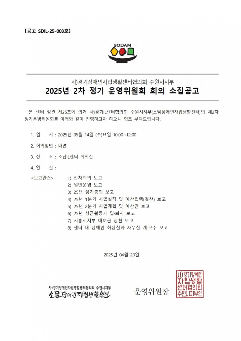 2025년 2분기 정기운영위원회 회의 소집공고 페이지 정보 작성자 소담센터 댓글 0건 조회 533회 작성일 25-04-23 11:22 본문 . 목록 이전글25년 활동지원 예산서 공고의 건 24.12.27 다음글25년 활동지원팀 신입 사회복지사 추가 합격자 공지 25.04.01 댓글목록 댓글목록 등록된 댓글이 없습니다.