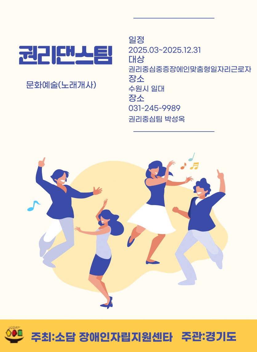 0220 지역장애인 권리댄스 사업 참여자 모집 페이지 정보 작성자 소담센터 댓글 0건 조회 58회 작성일 25-02-20 22:12 본문 장애인 권리댄스에 관심있는 지역장애인들의 많은 관심 부탁드립니다. 목록 이전글0220 권리를 알리는 미술동아리 사업 참여자 모집 25.02.20 다음글0220 미디어교육 참여자 모집 25.02.20 댓글목록 댓글목록 등록된 댓글이 없습니다.